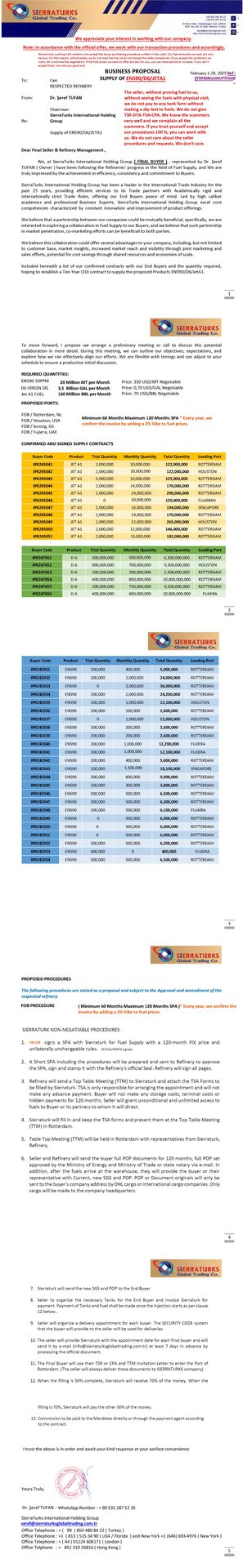 Thanks,Şeref TUFAN ( Mr ) PhDBusiness Owner / Ceo19 Mayıs Mah. Halaskargazi Cad. Çiftkurt Plaza, No.226/24 K.7 Şişli / İstanbul / Türkiyewww.sierraturkgroup.com // www.sierraturksglobaltrading.com.tr / www.portvale.com.tr / www.huc.com.tr // www.portakademi.com.trcorporate@sierraturkgroup.com // seref@sierraturksglobaltrading.com.tr / seref@portvale.com.tr / seref@huc.com.trOffice Telephone : + ( 90 ) 850 480 84 22 ( Turkey )Office Telephone : +1 ( 813 ) 515 34 90 ( USA / Florida ) and New York +1 (646) 693-4976 ( New York )Office Telephone : + ( 44 ) 01224 606171 ( London )Office Telphone : + 852 310 26816 ( Hong Kong )==============================================================================================================================================================================================This e-mail and any attachment are confidential and intended solely for the use of the individual to whom it is addressed. If you are not the intended recipient, please telephone or email the sender and delete this message and any attachment from your system. Unauthorized publication, use, dissemination, forwarding, printing, or copying of this e-mail and its associated attachments is strictly prohibited. Let's respect the environment together. Only print this message if necessary. Help Save the Planet, Recycle!This is a very important message to anyone involved in the commodities industry on the new measures with respect to Buyer`s / Seller’s, Re-sellers, Brokers & Intermediaries for the Sales and Purchase Agreements. From now on, if an ICPO, LOI, RWA, or BCL is issued and the document is not real, true and /or actually verifiably factual, the Seller/Seller Mandate will be able to inform the FBI, ICC, and INTERPOL. In addition, after an FCO/CI/SPA is sent to the Buyer, there should be a formal answer to Seller from Buyer in a timely manner in accordance with the agreement between the parties. If there is no response from the Buyer in a timely manner or defaults the agreement for not been able to proceed further, the buying company will be reported to the FBI, ICC and INTERPOL. And if these same actions are repeated by the Seller for not further the procurement after Buyer met all obligations, the Buyer too will also report for abuse of the SPA, NCND, LOI, ICPO, AND RWA OR BCL, FOR THIS IS NOW A FEDERAL OFFENSE.